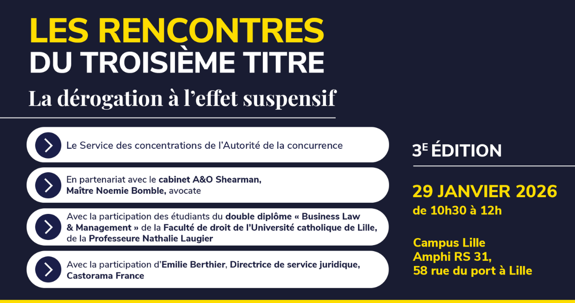 La Faculté de Droit de l’Université Catholique de Lille accueillera la 3e édition du colloque « Les rencontres du IIIe titre », organisée par le Service des concentrations de l’Autorité de la concurrence, en collaboration avec le cabinet A&O Shearman et notre Faculté de Droit.