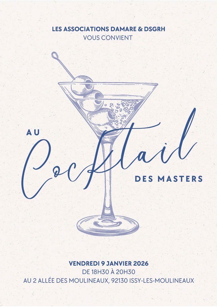 Les étudiants des Masters DAMARE (Droit des Affaires et Management des Risques de l’Entreprise) et DSGRH (Droit Social et Gestion des Ressources Humaines) vous invitent à un cocktail dédié aux échanges et au partage d’expérience.