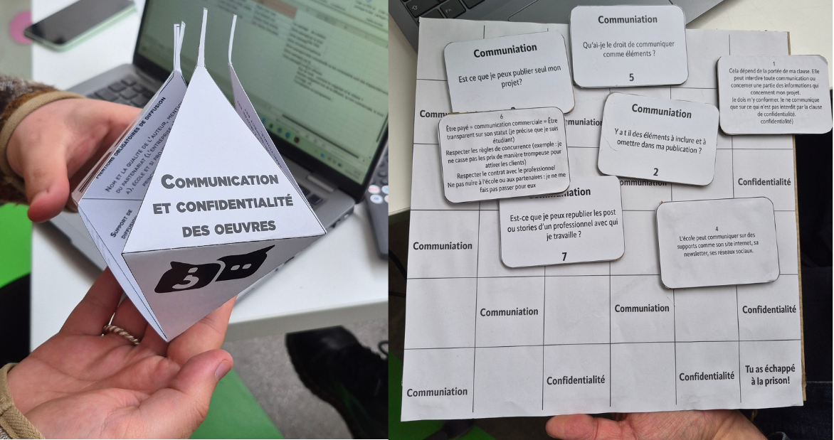 L’après-midi a donné lieu à la concrétisation de ce travail d’équipe, avec des propositions visuelles traduisant les analyses juridiques initiales. Les étudiants en droit ont poursuivi leur implication en veillant à la précision des contenus, tandis que les designers ont apporté toute leur créativité pour en faciliter la compréhension.